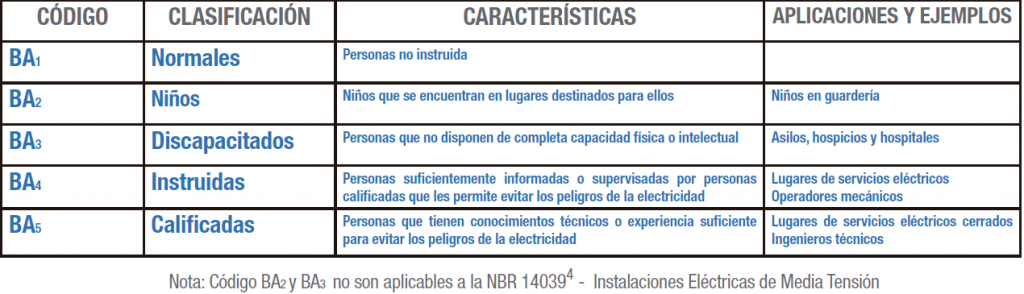 Personas instruidas – BA4 y personas calificadas BA5, definidas en las normas de la ABNT2, son aquellos profesionales que según la NR-101, podrán estar autorizados a ejecutar (considerándose las demás premisas establecidas por la NR-101) actividades en instalaciones eléctricas, ya sea que estén habilitados, calificados o capacitados.
