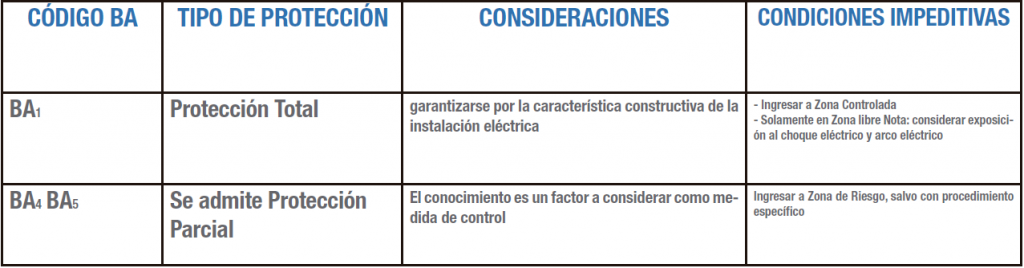 De esta forma, cuando se trate de personas BA1 – No instruidas, las medidas de control para la protección al riesgo de choque eléctrico por contacto directo, se deben especificar (protección total), conforme veremos más adelante.